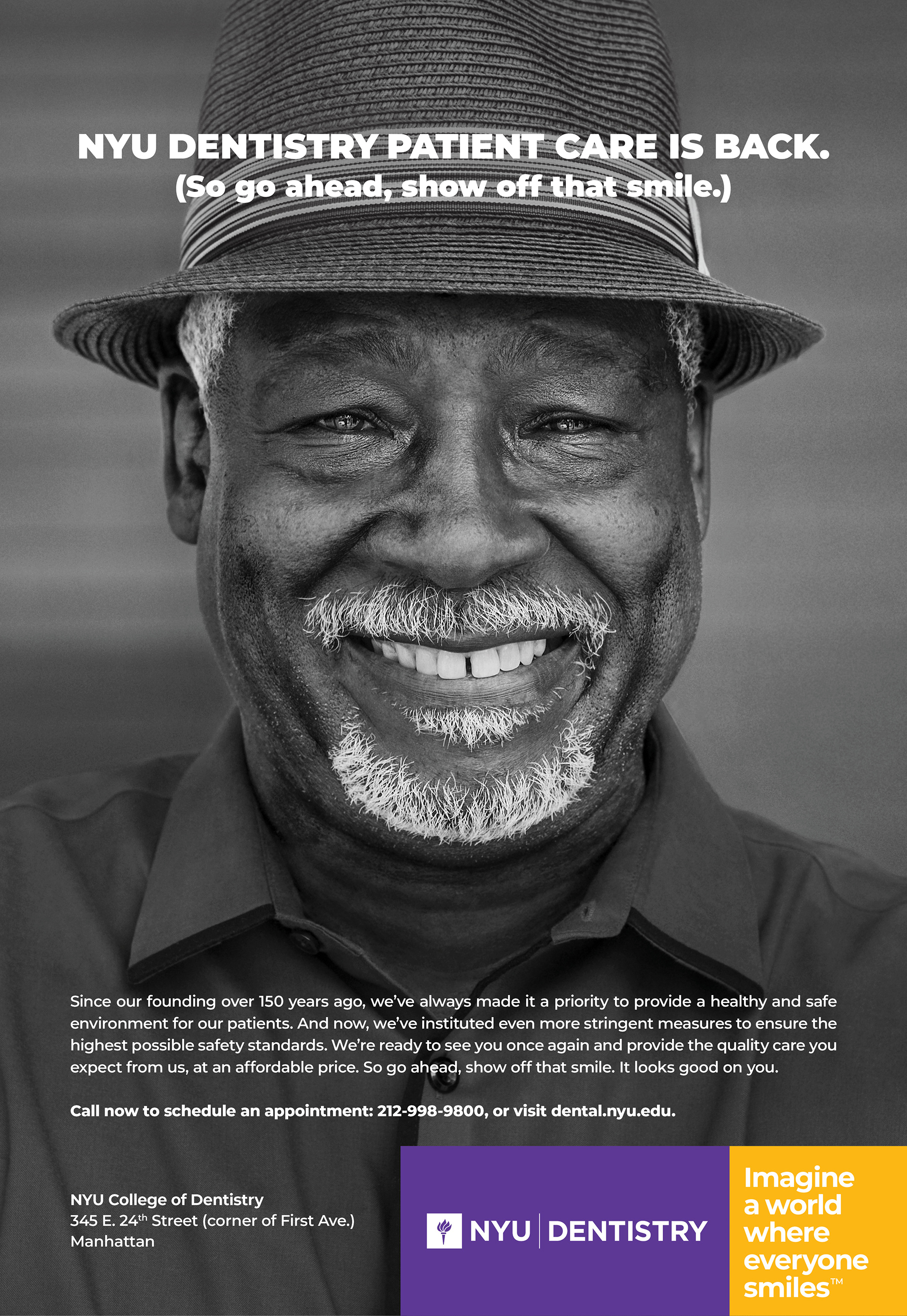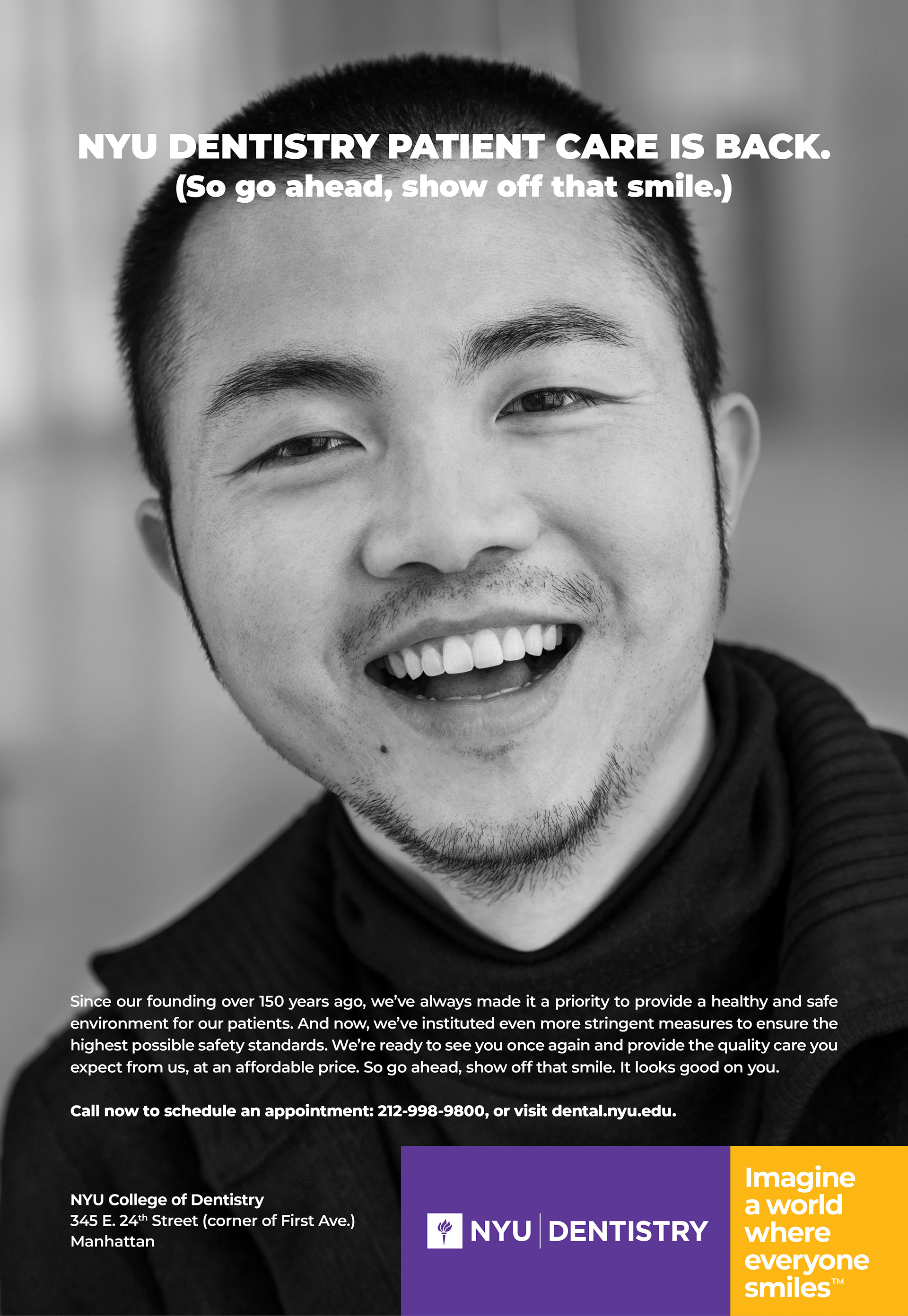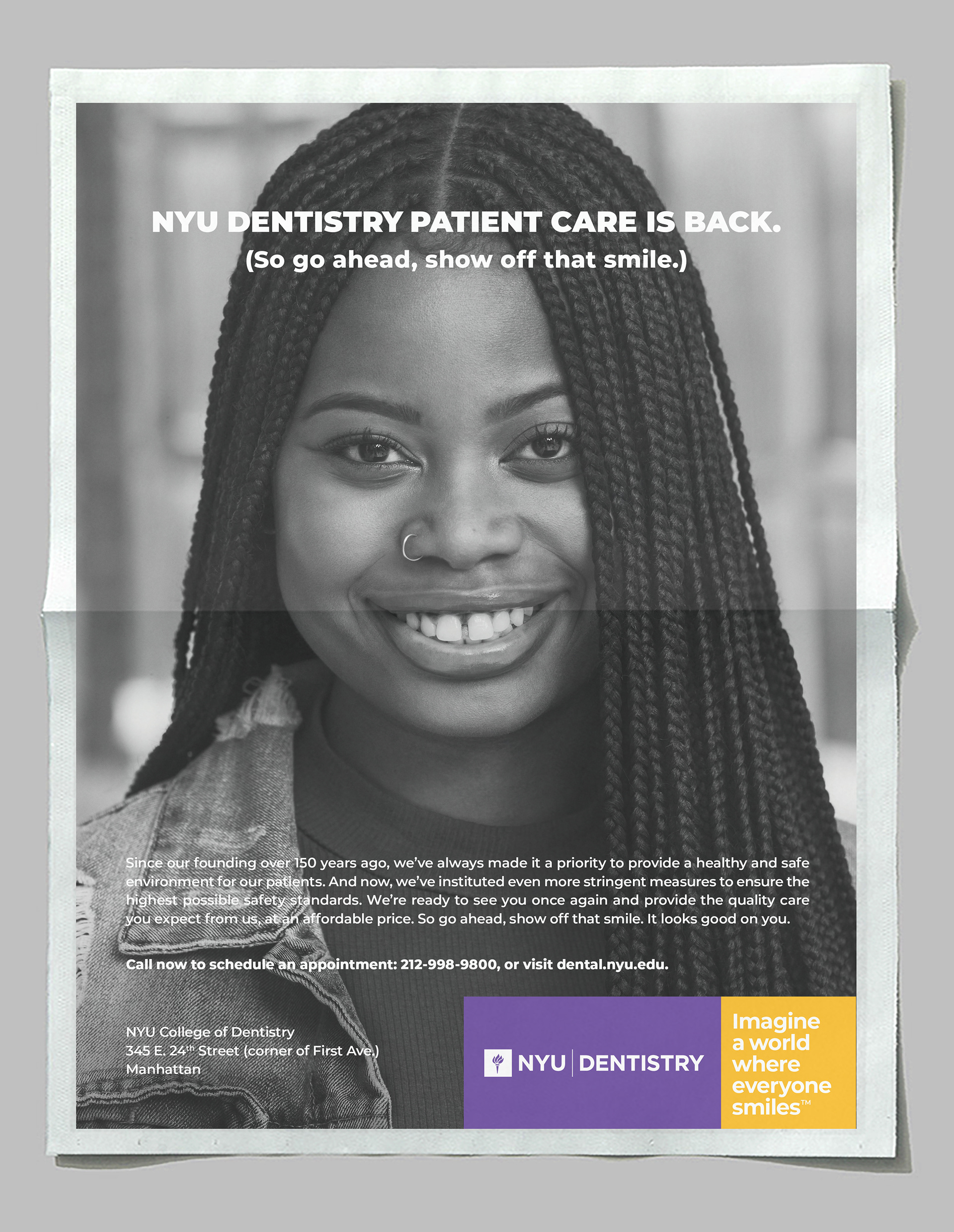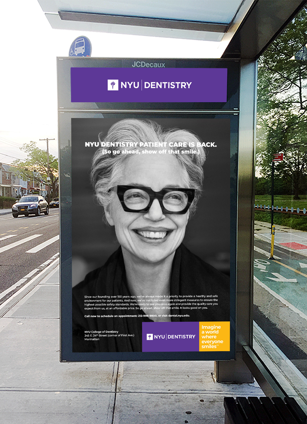 Art direction, design and production of final deliverables for NYU Dentistry's rebranding campaign, including presenting concept to client, choosing talent, and assisting with studio photoshoot.